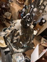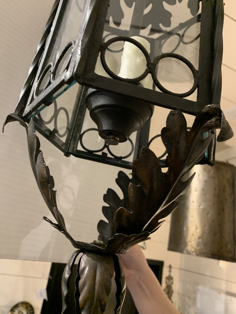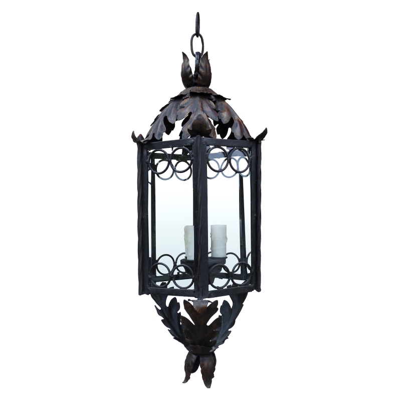 c.1900 IRON & GLASS LANTERN W/ CIRCLE AND ACANTHUS MOTIF