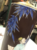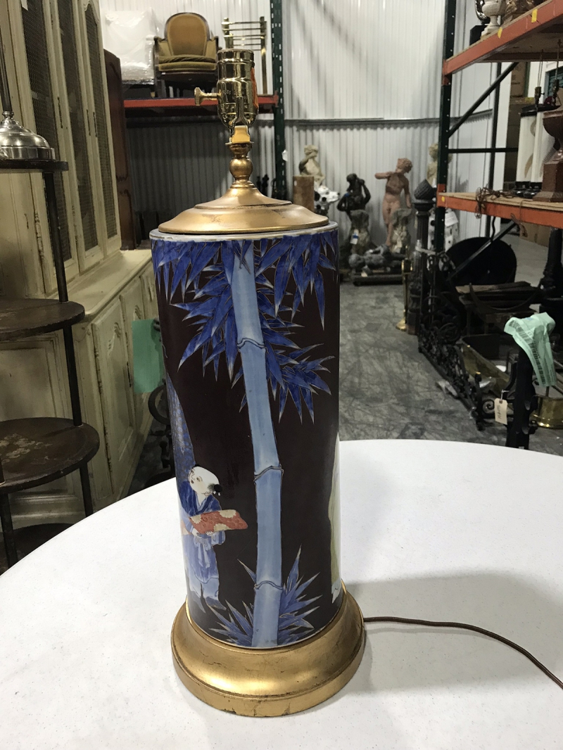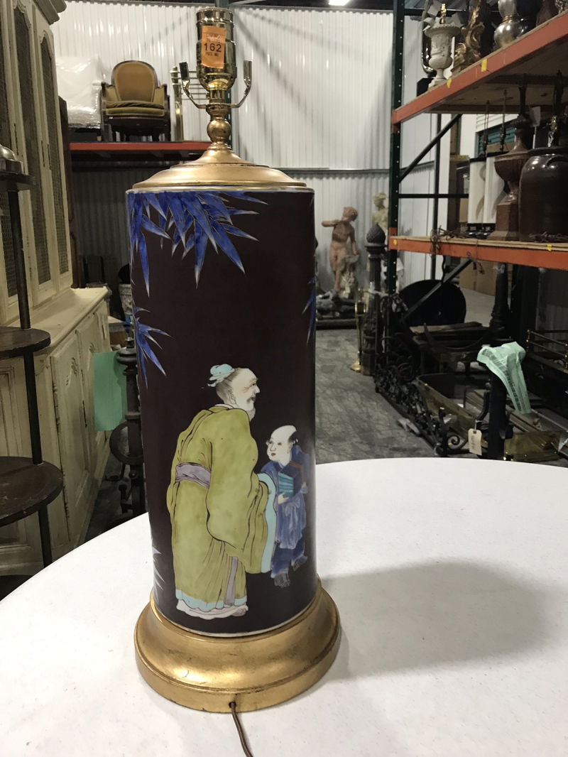 MID C CHINESE POTTERY LAMP W/ FIGURAL SCENE LAMP ON CUSTOM GILT BASE
