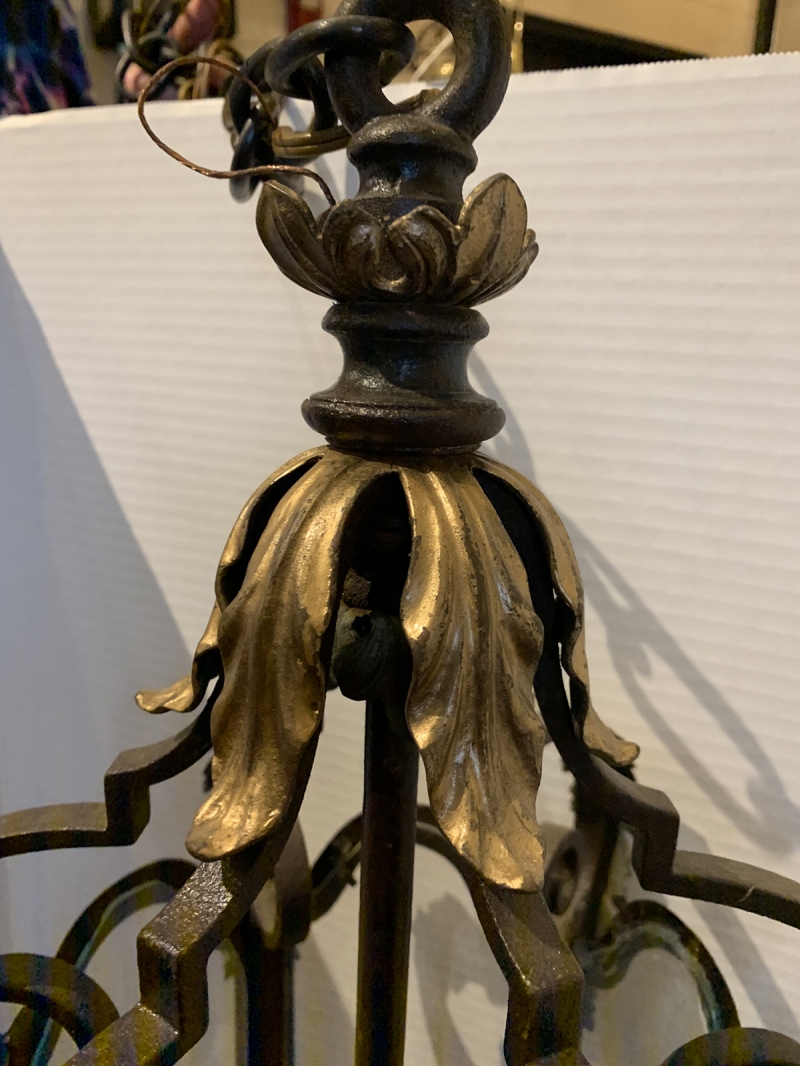 20thC HEXAGONAL IRON THREE-LIGHT LANTERN, GILT ACANTHUS LEAF DETAILS