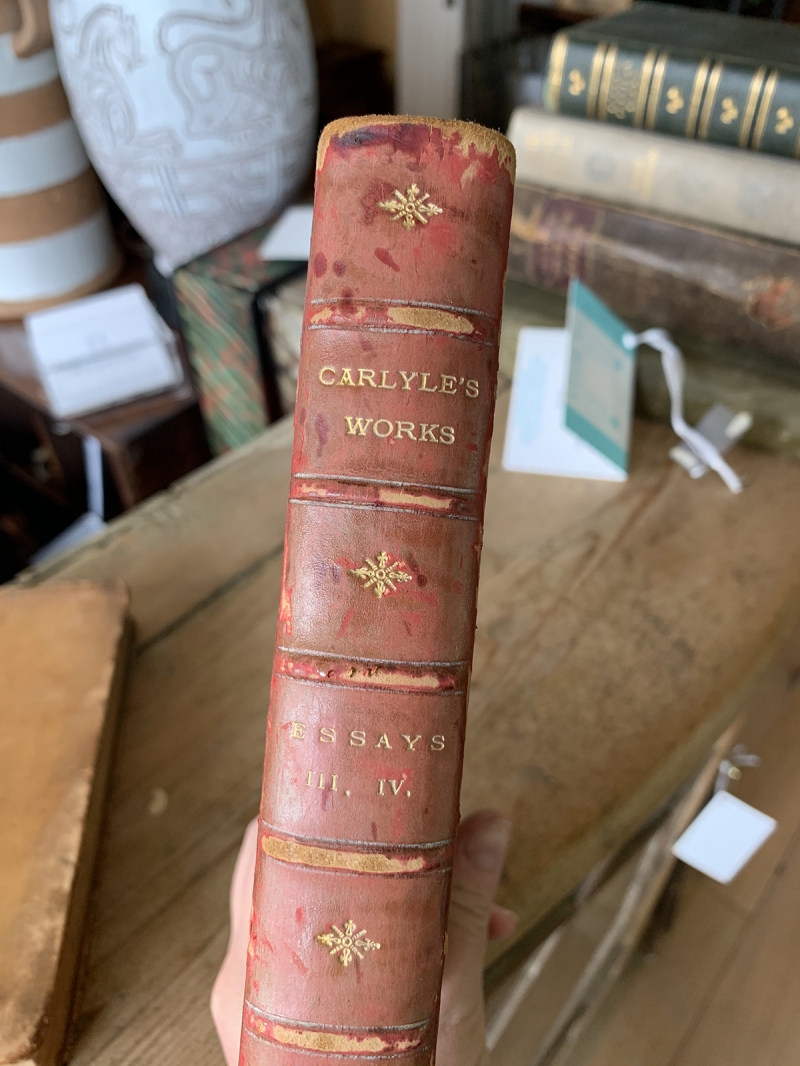 ASSEMBLED PAIR OF 18th/19thC ENGLISH LEATHER BOUND BOOKS. RED: VOL III & IV OF "CRITICAL & MISCELLANEOUS ESSAYS BY THOMAS CARLYLE, c.1869, LONDON
