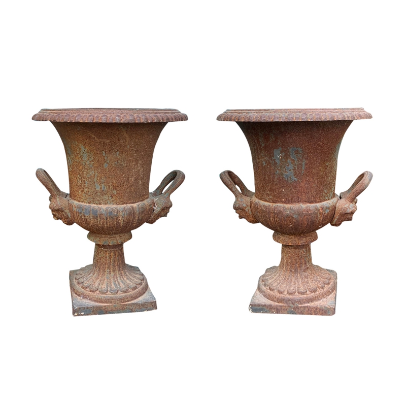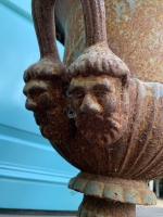 PAIR OF 19thC NEOCLASSICAL IRON URNS W/ HANDLES & BEAUTIFUL FACE DETAIL