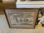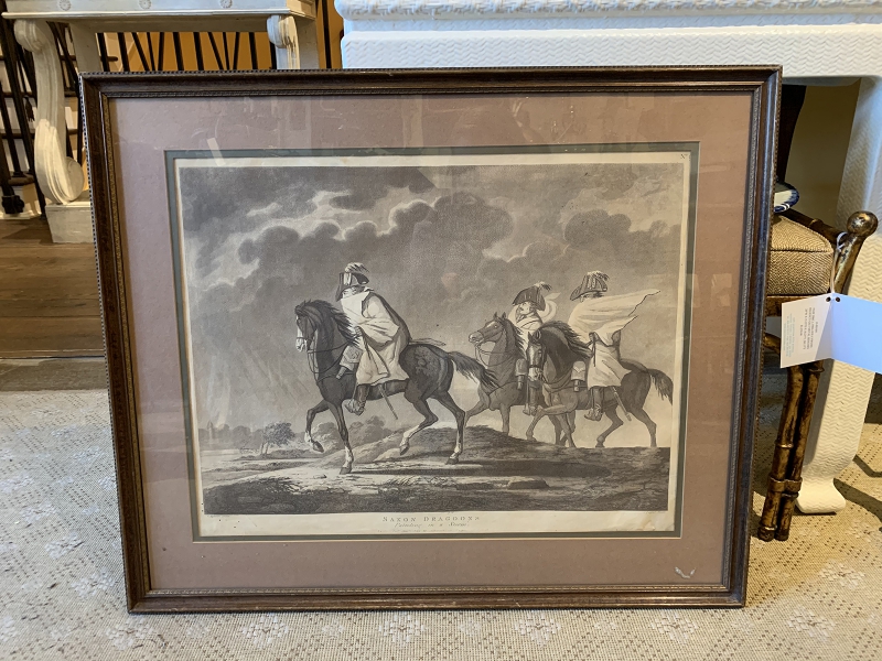LATE 18thC c.1799 ENGLISH AQUATINT ENGRAVING OF MILITARY EVOLUTION TITLED "SAXON DRAGOONS PATROLING IN A STORM" BY C. ZIEGLAR, SIGNED, ENGRAVED AFTER ORIGINAL DESIGNS BY CONRAD GESSNER, A SWISS ARTIST IN LONDON FROM c.1796-1804