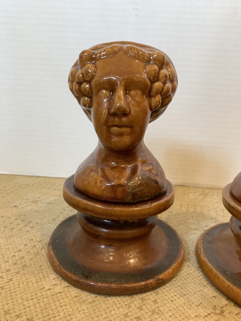 PAIR OF 19thC ENGLISH ROCKINGHAM GLAZED STONEWARE FIGURAL WOMAN WINDOW RESTS / SUPPORTS ON STANDS, UNMARKED