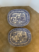 PAIR OF 19thC ENGLISH STAFFORDSHIRE TRANSFER PEARLWARE CHARGERS IN BLUE WILLOW PATTERN W/ ROYAL COAT OF ARMS MARK & INITIALS JC, PROB. FOR JOSEPH CLEMENTSON c.1794-1871 |