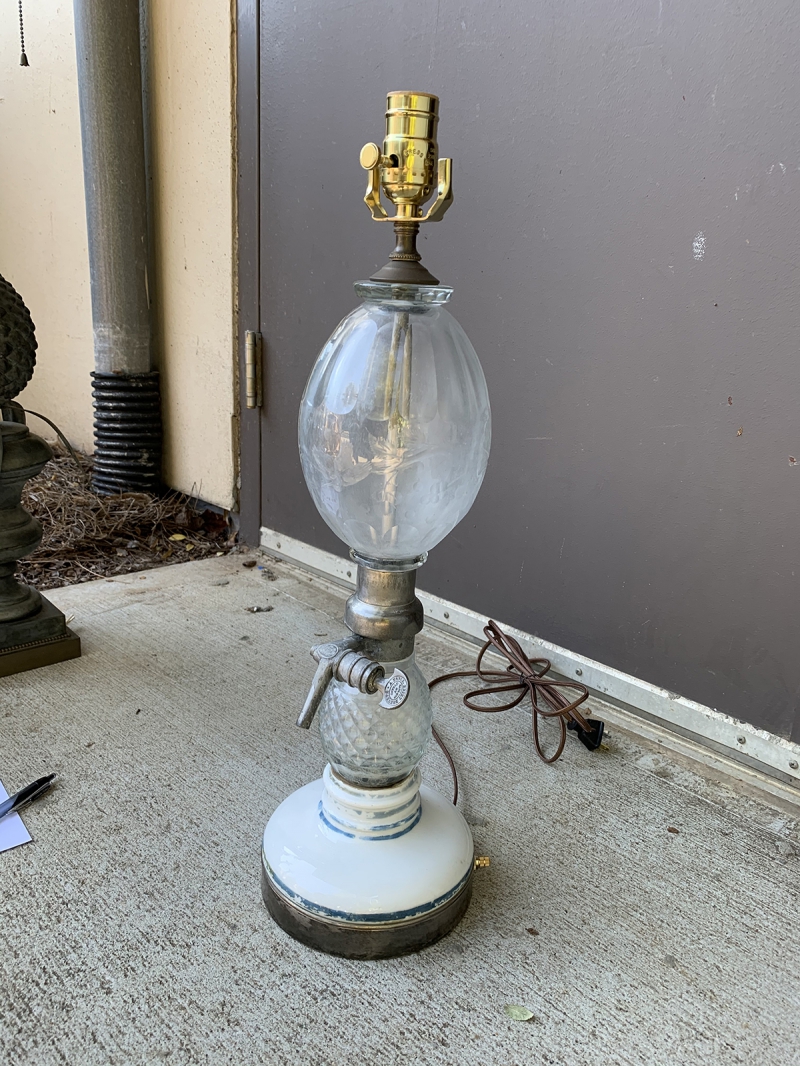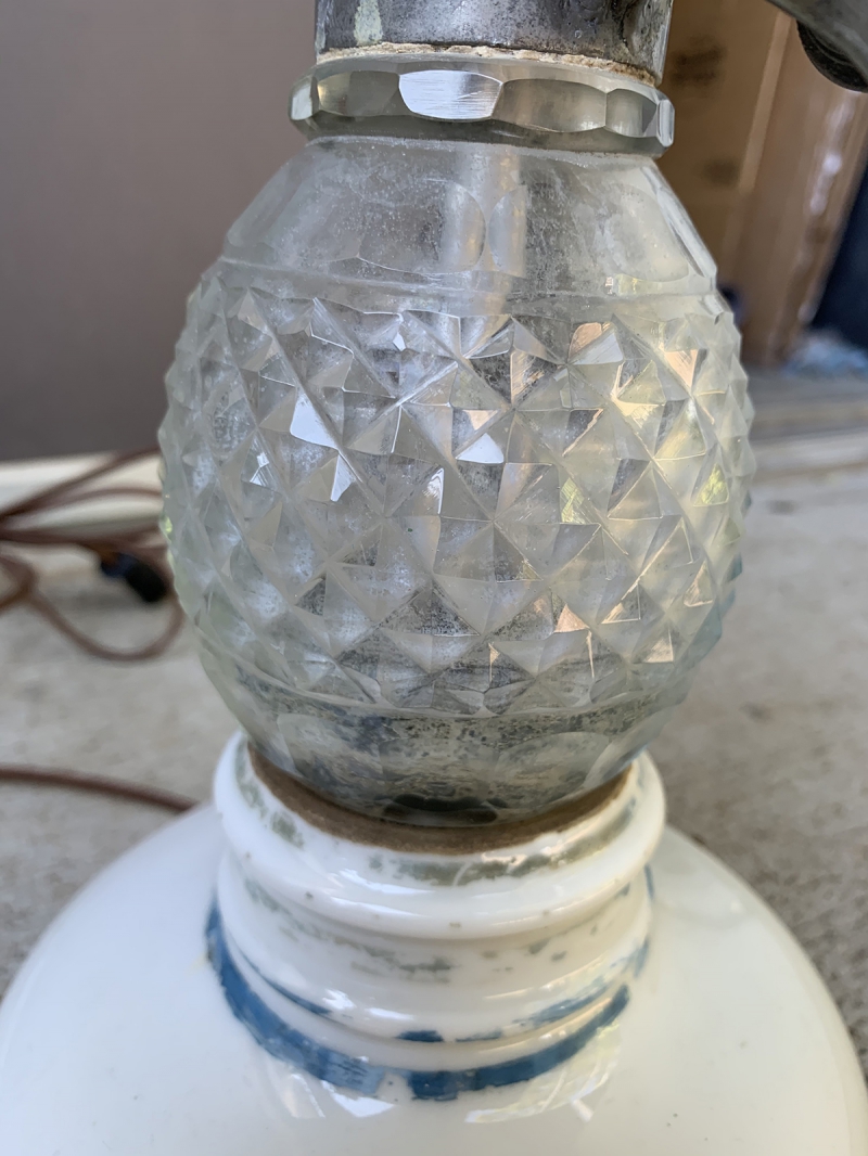 LATE 19th/EARLY 20thC FRENCH PARIS GLASS & PEWTER BRIET BREVETE SELTZER BOTTLE AS LAMP ON PORCELAIN BASE, MARKED